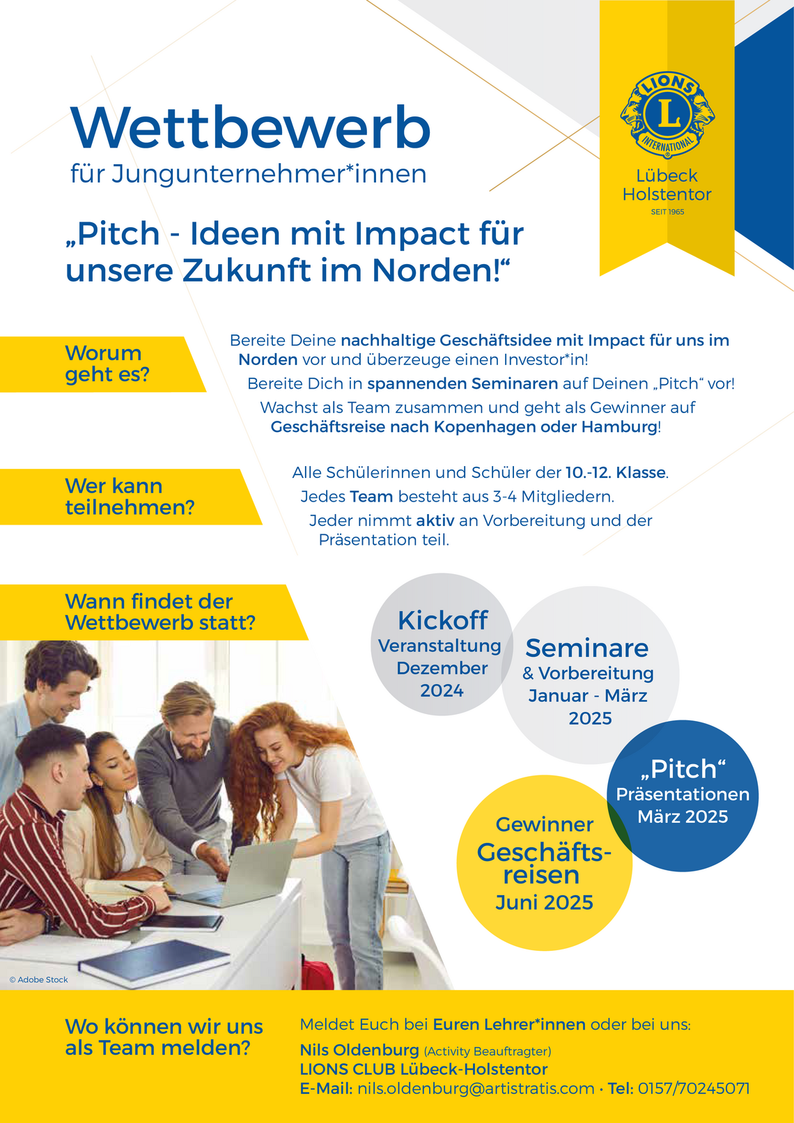 Das ist der Wettbewerb des Lions Club Lübeck-Holstentor für Schülerinnen und Schüler der oberen Jahrgänge Lübecker Schulen und Umgebung, der 2025 bereits in seine 4 te Saison gegangen ist. Mit dem Wettbewerb wollen wir Schülerinnen und Schüler ermöglichen, in die Welt der Unternehmensgründung einzutauchen und Mut zu Fassen eigene Ideen mit Impact für uns im Norden umzusetzen.